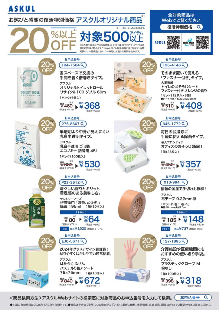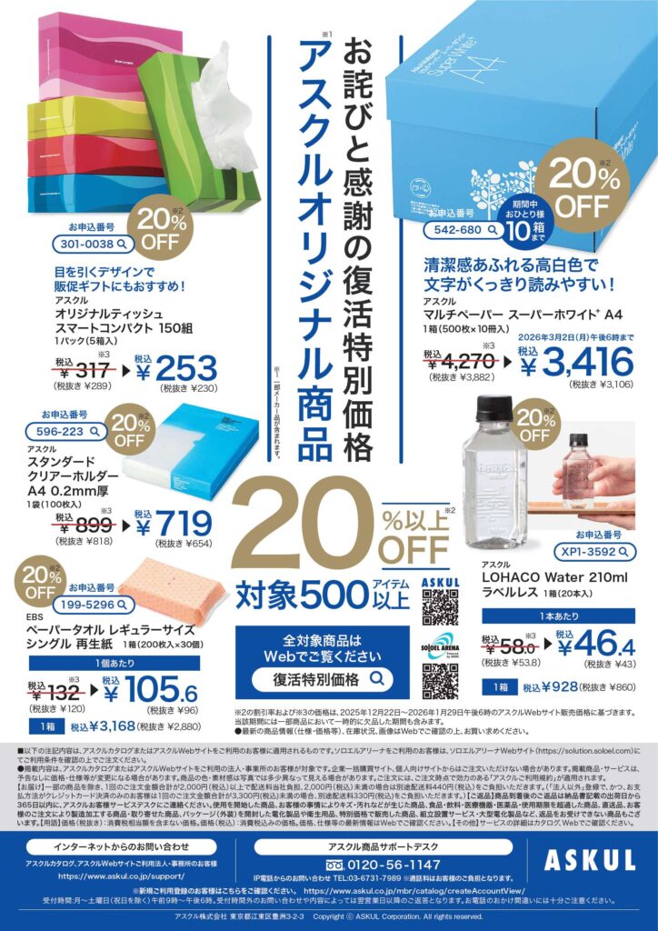 【お詫びと感謝の復活特別価格】アスクルオリジナル商品20%OFF|~2026年3月2日(月)