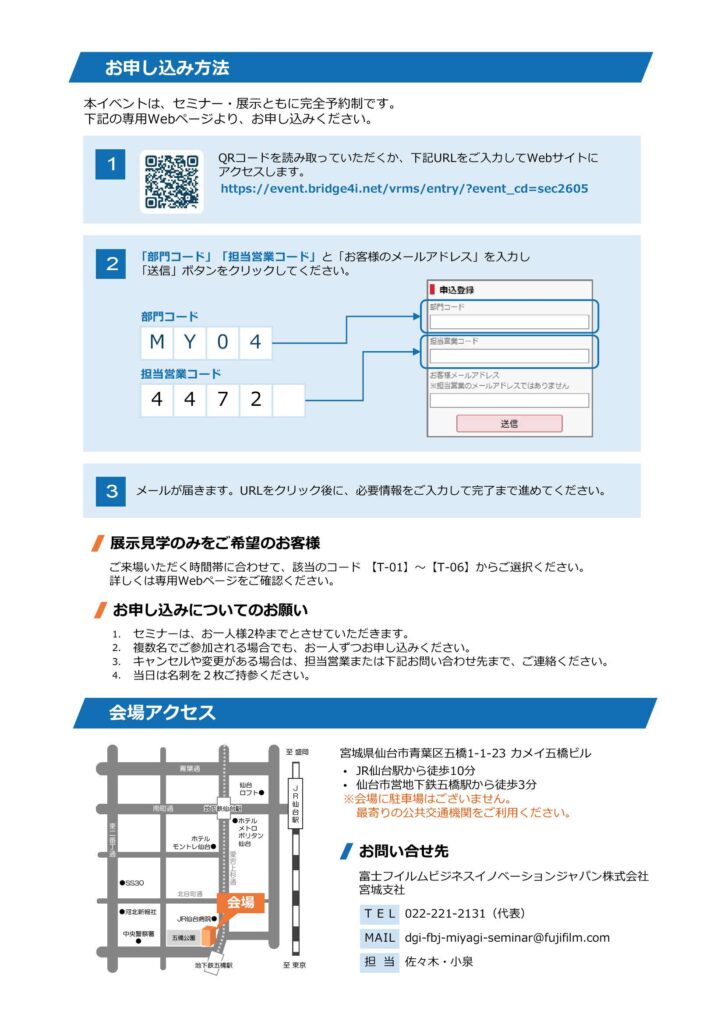 | 会場 | 仙台市青葉区五橋1-1-23 カメイ五橋ビル 富士フイルムビジネスイノベーションジャパン株式会社 宮城支社 |
